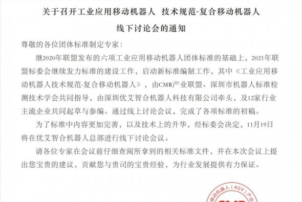 關于召開《工業應用移動機器人 技術規范-復合移動機器人》線下討論會的通知