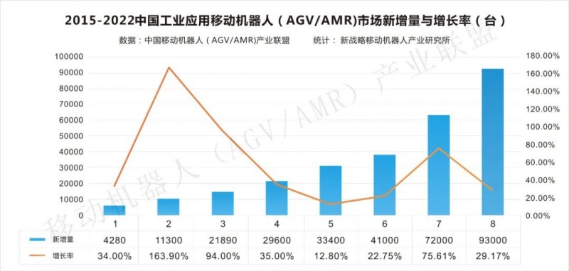 根據CMR產業(yè)聯(lián)盟數據,新戰(zhàn)略移動機器人產業(yè)研究所統(tǒng)計,2022年度,中國工業(yè)應用移動機器人(AGV/AMR)銷售數量93000臺(含銷往海外市場),較2021年增長29.17%,市場規(guī)模達到185億元,同比增長46.82%。