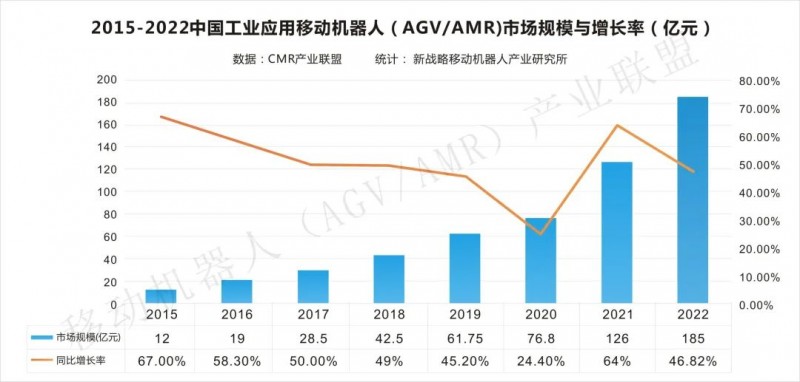圖表:2015-2022中國工業應用移動機器人(AGV/AMR)市場規模與增長率