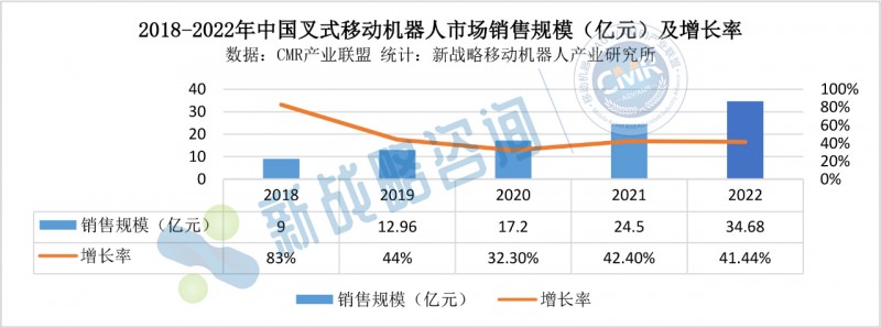 據(jù)CMR產(chǎn)業(yè)聯(lián)盟數(shù)據(jù)、新戰(zhàn)略移動(dòng)機(jī)器人產(chǎn)業(yè)研究所統(tǒng)計(jì),2022年中國(guó)叉式移動(dòng)機(jī)器人銷量達(dá)13300臺(tái),同比增長(zhǎng)66.25%,市場(chǎng)規(guī)模約為34.68億元,同比增長(zhǎng)41.55%。