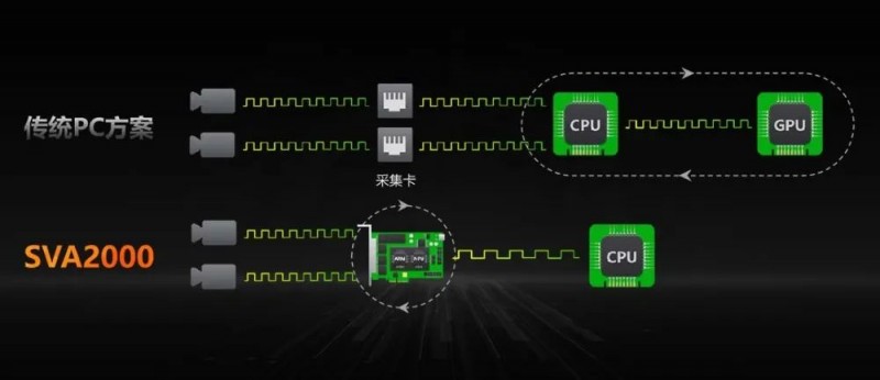 數據流無需經過CPU,在SVA2000上即可完成全部視覺功能,CPU只在有需要時做少量的控制功能,大大降低了CPU負載,在某些應用中甚至不需要CPU參與工作。