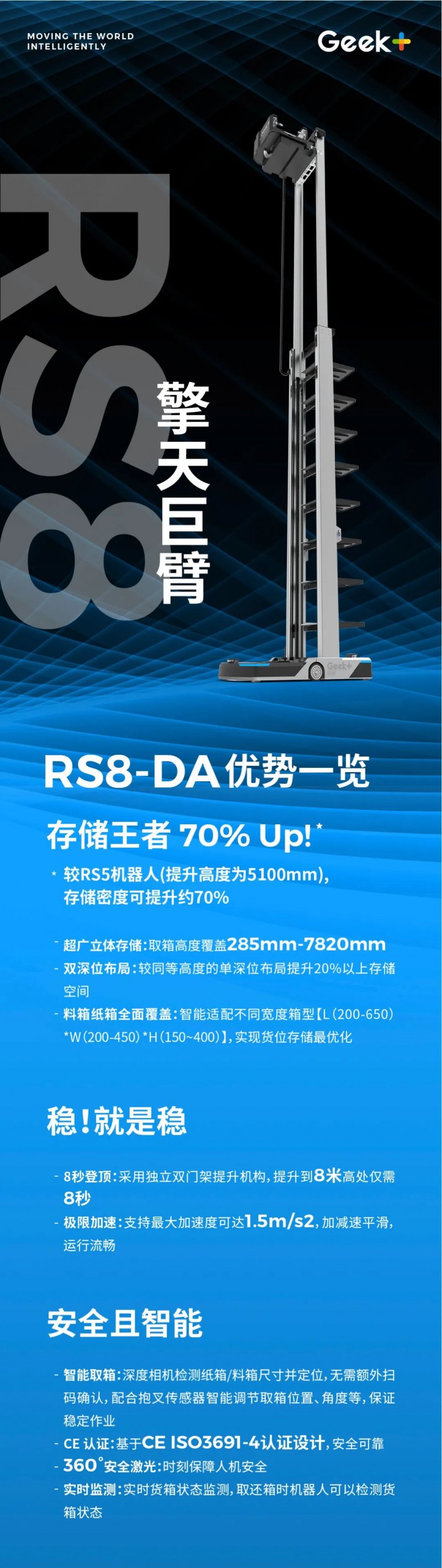 目前,使用傳統(tǒng)人工倉的服裝企業(yè)行業(yè)所使用的傳統(tǒng)人工倉所來說,廠商面臨的不僅對存儲密度、揀選效率和人員管理有著較高要求,同時還需要解決人工揀選難度大、顆粒度管理較粗及揀選復核人效低等痛點。此次最新推出的RS8貨箱機器人正是助力服裝行業(yè)解決以上痛點的機器人存揀利器。