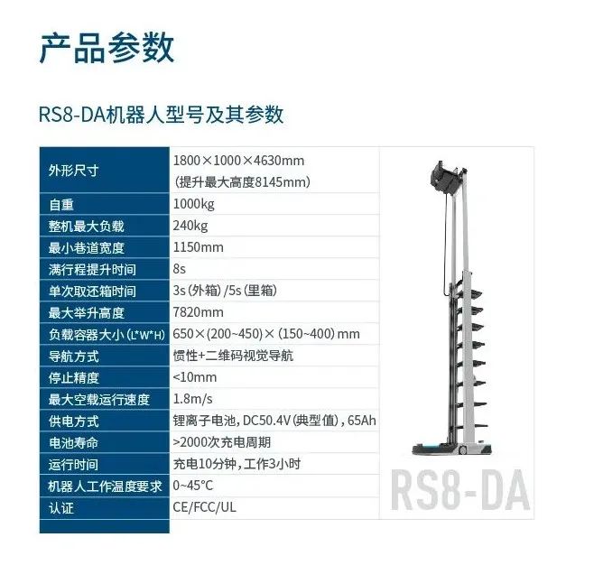 配置雙深可變寬度抱叉的機型為RS8-DA,其采用雙深位結構,配合智能調(diào)寬抱叉,可根據(jù)貨品自動調(diào)整抱叉寬度,同時可以根據(jù)實際貨箱尺寸分配存儲位置,保證最小貨位間隔。