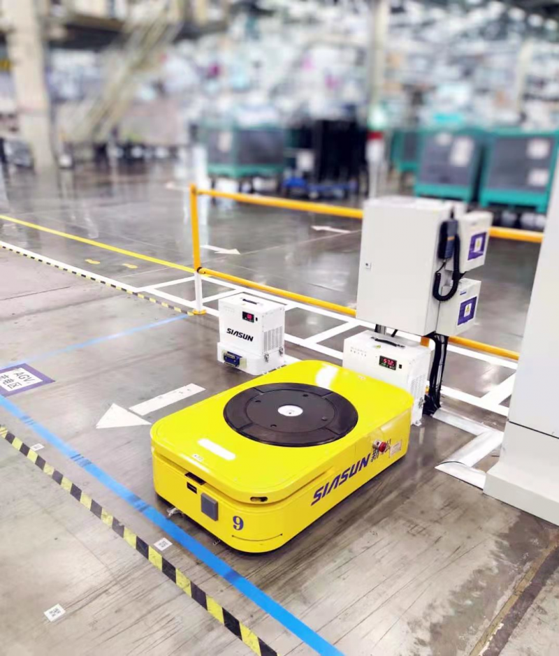 2019年新松機器人為國內某知名車企在總裝車間的儀表線、電池線、門段揀選線等產線提供數(shù)十臺物流配送AGV。項目在實施過程中,原定選用的是激光SLAM導航,由于部分生產線邊特征點不明顯,環(huán)境特征變化太多,導致SLAM導航精度不高,定位不準,影響了使用效率。經過分析后,新松輔以紋理導航解決了因局部區(qū)域特征變化較大而產生的問題。在特殊路段,通過對現(xiàn)場地面紋理的拍攝,與AGV本體已有紋理模型構圖進行比對,從而確定精確位置,提高了現(xiàn)場的導航精度和定位精度,滿足了客戶的使用效率要求。