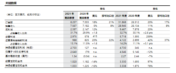 ABB集團首席執(zhí)行官羅必昂表示:“2021是表現(xiàn)出色的一年,市場需求強勁,盈利能力提高,業(yè)務組合進一步鞏固,同時現(xiàn)金流保持充沛,我們對2022年滿懷信心。”