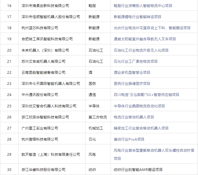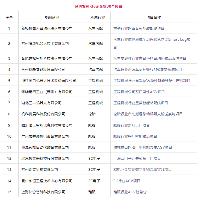 該合集甄選了30家企業30個經典案例,涵蓋了汽車汽配、工程機械、第三方物流、3C電子、醫藥醫療等眾多行業,無論是產品的創新度還是技術實力都有較高的代表性,是中國工業應用移動機器人經典之作,具體入選案例名錄如下:
